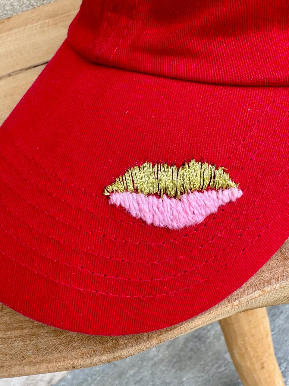 Boné com desenho de bocas bordados à mão, produzido em comemoração ao Mês da Mulher em uma collab Self-Care com a make up artista Yoanna Mihalopoulos.