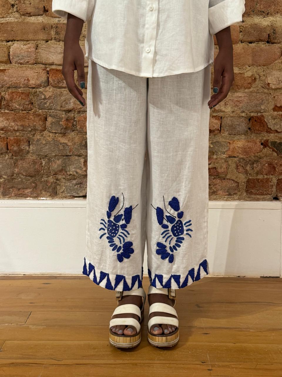 A Calça Lagosta é feita em 100% linho, pintada e bordada a mão com miçangas linha azuis.