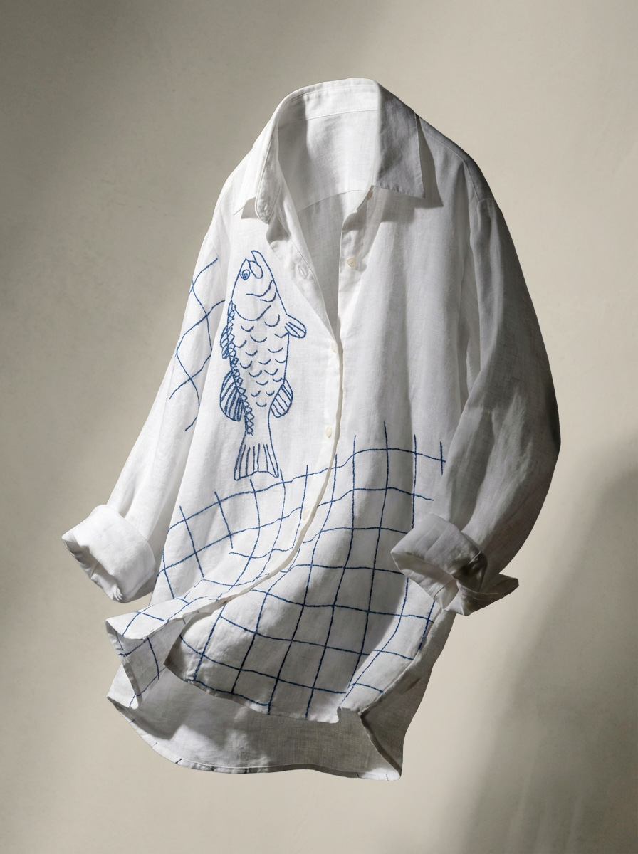 O destaque fica por conta do bordado artesanal em azul, feito à mão, que traz um desenho delicado inspirado no universo marítimo. Cada detalhe valoriza o trabalho manual, tornando cada camisa única. Uma peça leve, artística e cheia de personalidade.
