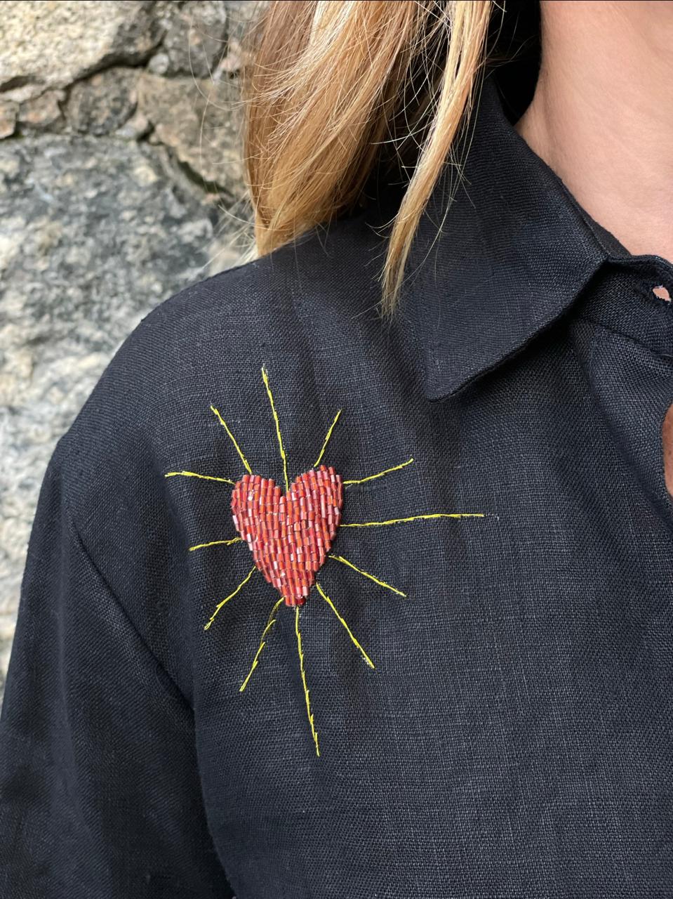 A camisa hearts é feita em 100% linho, bordada a mão com vidrilhos vermelhos e linha dourada. Elegante e estilosa, nossa marca registrada.