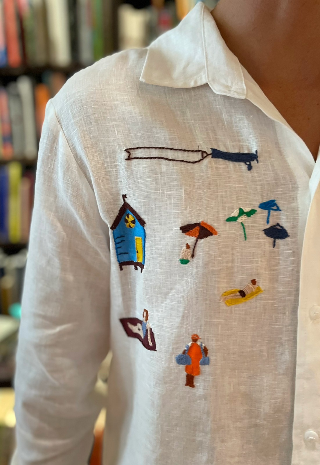 Camisa masculina em linho branco, com cenas cariocas que retratam o estilo de vida alegre. Com pinturas e bordados feitos à mão, essa peça exclusiva combina a leveza do linho com o espírito vibrante e descontraído do Rio de Janeiro, trazendo um toque de cor e energia para o seu look.