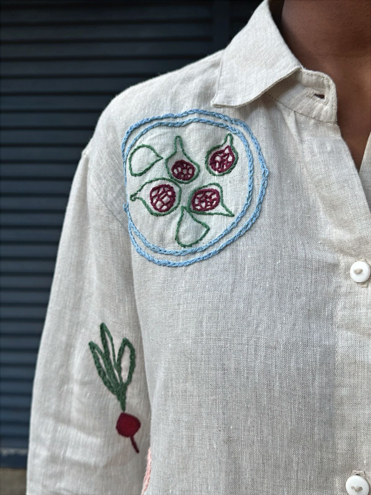 Camisa 100% linho, adornada com bordados feitos à mão que evocam a rica essência da gastronomia italiana. Cada detalhe é cuidadosamente elaborado para refletir a tradição e o sabor da culinária italiana, tornando esta peça uma celebração única do estilo e da cultura.