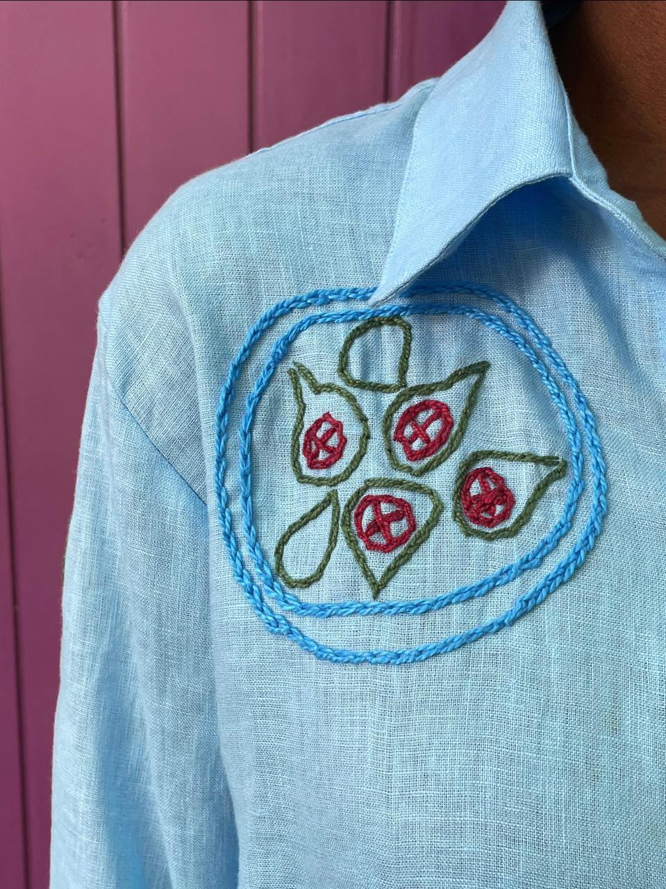 A camisa Oliva azul é feita em 100% linho na cor azul clara, com elementos da culinária italiana.