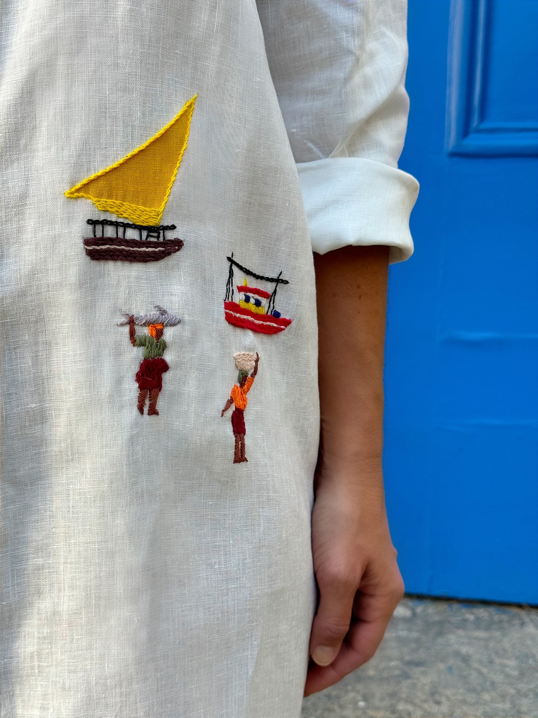 A Chemise Bahia é feita em 100% linho, bordada e pontada à mão com ícones que remetem o espírito bahiano. Alegre, divertida e cheia de charme.