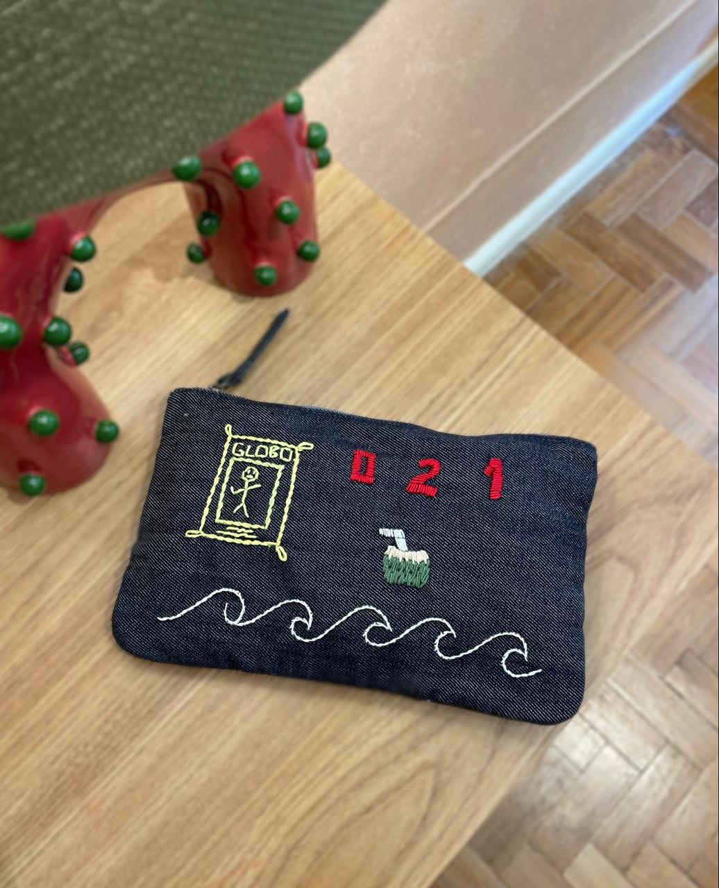 A Necessaire Rio P é feita em jeans, com fecho e bordada à mão nos dois lados. Medidas: comprimento : 25cm x altura :16cm
