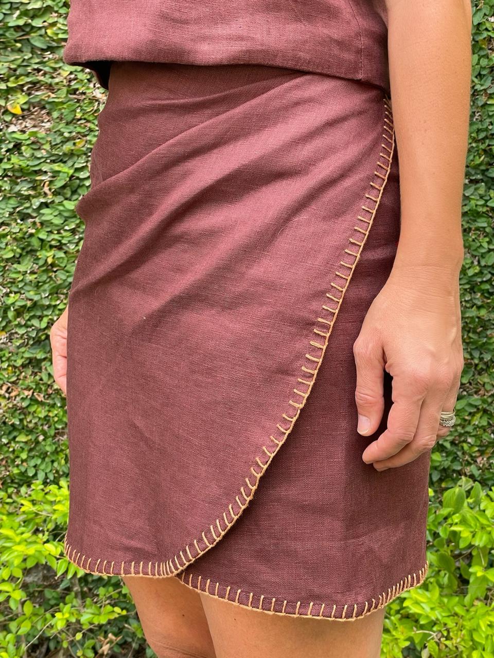 A saia pareô chocolate é feita e 100% linho na cor marrom, com detalhe na barra bordada a mão com linha bege. É tamanho unico, com amarração na cintura.
