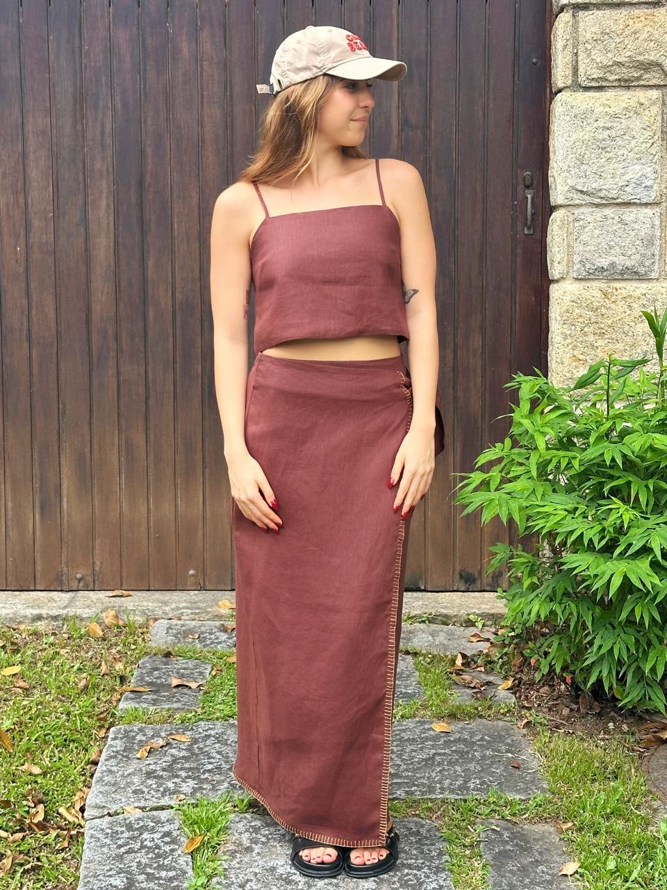 A saia Pareô longa é feita em linho 100% na cor chocolate. Bordada na barra com linha caramelo e amarração na cintura.