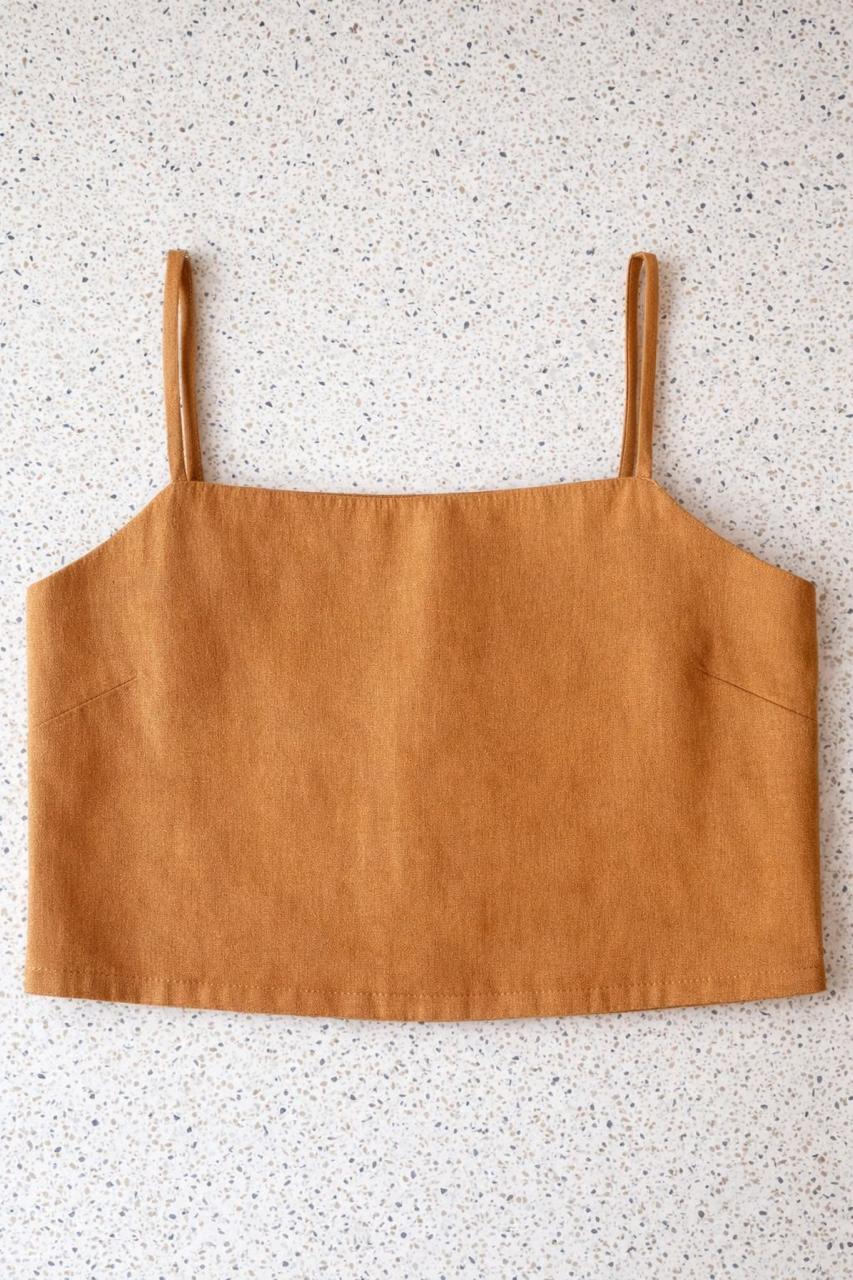 O Top Beta Caramelo é feito em 100% linho na cor caramelo, com decote reto, alça ajustável e botoes nas costas. Peça coringa para qualquer look.