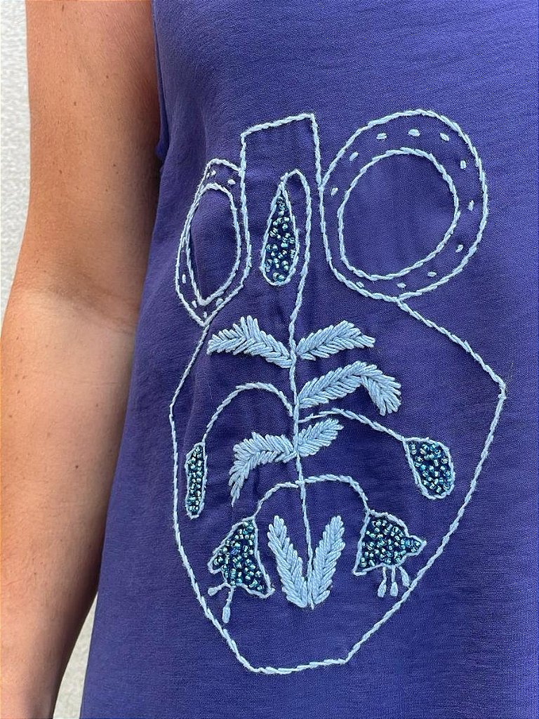 O Vestido Beth Vasos Azul é feito 100% de liocel com decote V, costas nadadora e babado na barra. Os vasos são pintados à mão com flores bordadas e miçangas. Elegante, sofisticado e único.