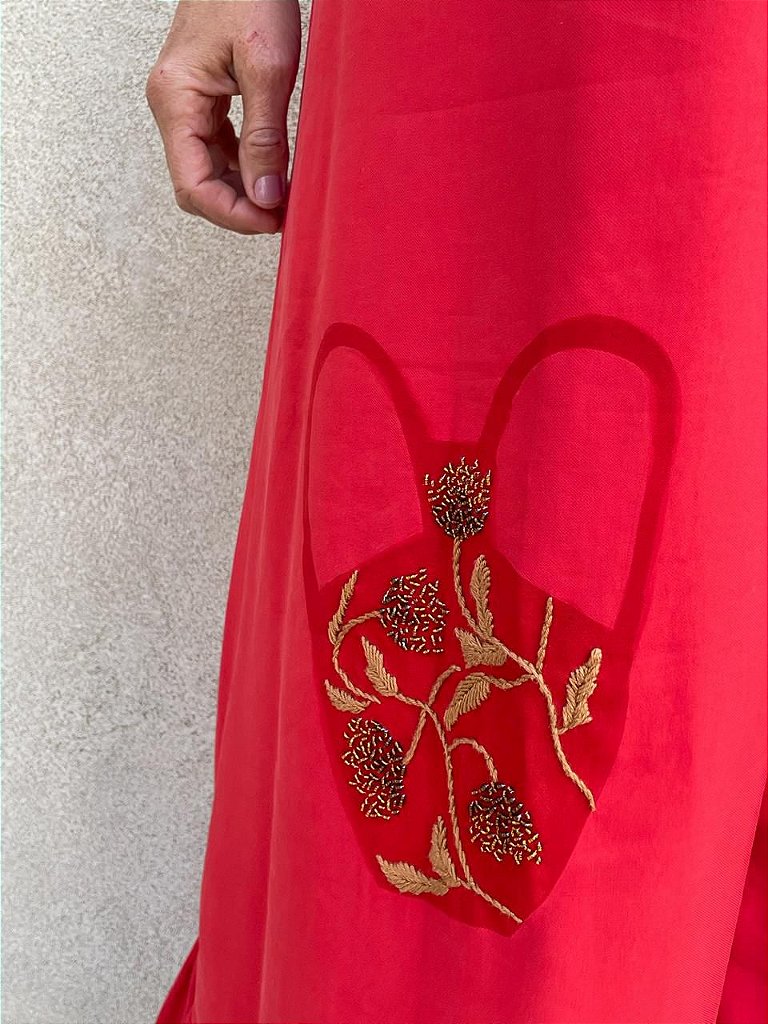 O Vestido Beth Vasos Vermelho é feito 100% de liocel com decote V, costas nadadora e babado na barra. Os vasos são pintados à mão com flores bordadas e miçangas. Elegante, sofisticado e único.