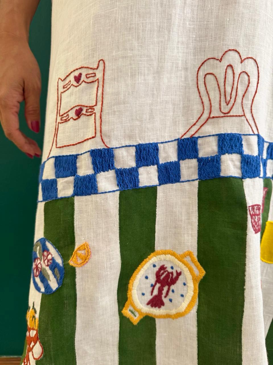 Vestido midi 100% linho, com fendas laterais, sem manga, bordado e pintado à mão, recriando uma mesa com pratos tipicos da culinária italiana.