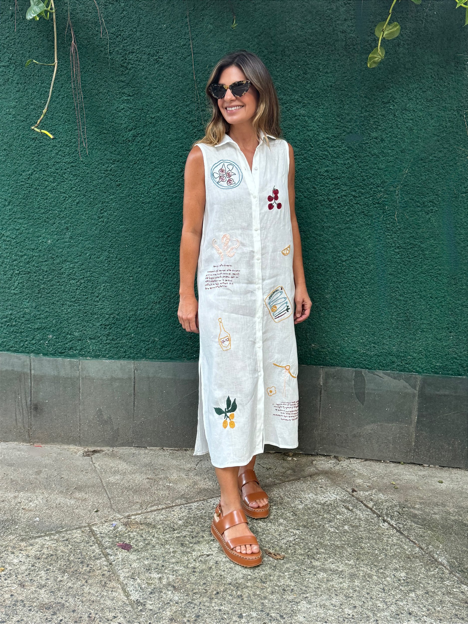 O vestido max Oliva é super versátil e charmoso. Feito em 100% linho, é todo bordado à mão com referências da cozinha meditêrranea. Sem manga, abotoado na frente e fendas laterais.